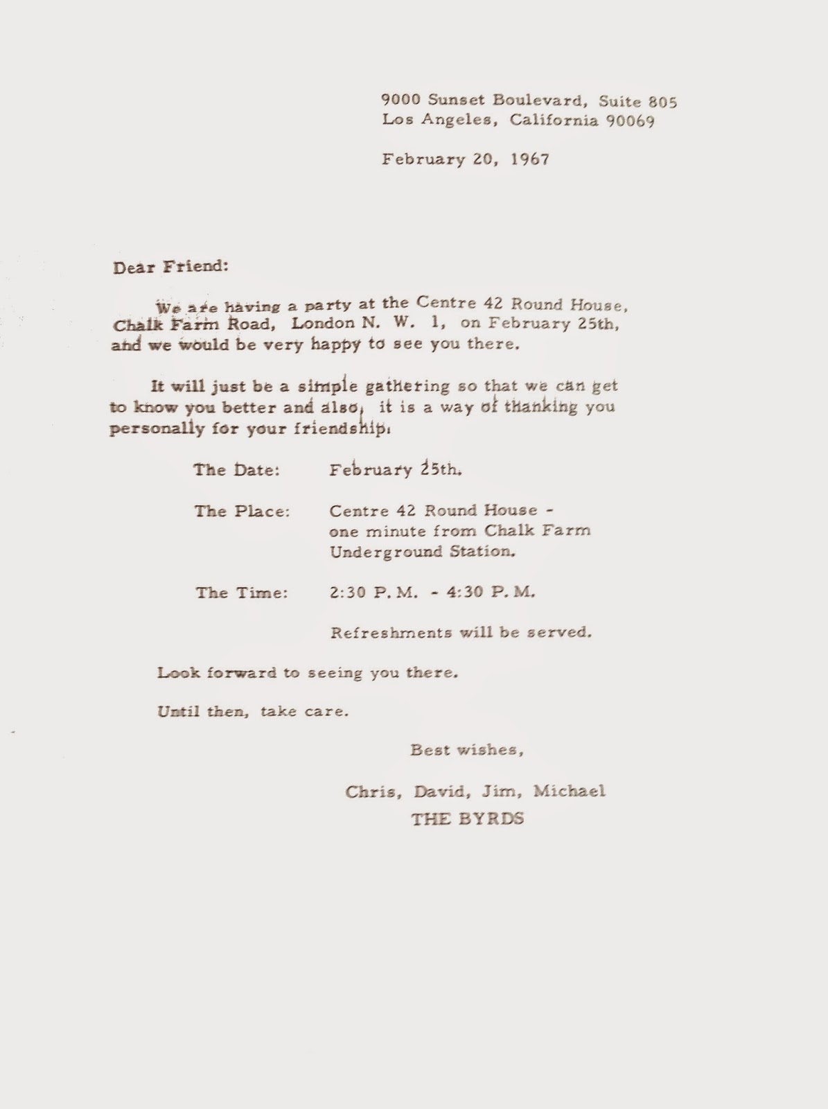 The Byrds had a small get together for die-hard fans at the Round House in London on Saturday 25th February 1967.